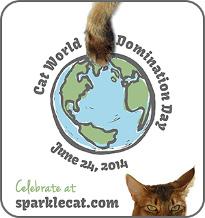 I'll be celebratin' CAT WORLD DOMINATION DAY once again this year. Thanks ever-so-much, Sparkle for creatin' this wonderful graphic to get the celebrations started.